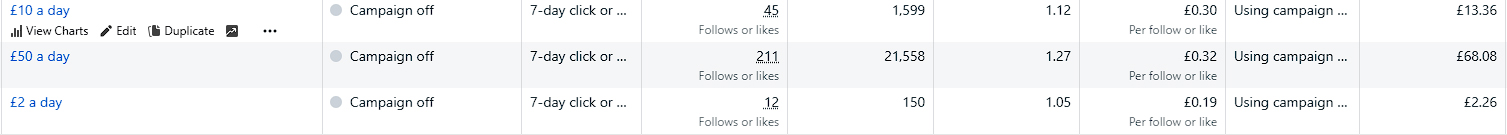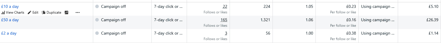 These campaigns are all identical, with the same ad and settings. The only difference is the budget.
