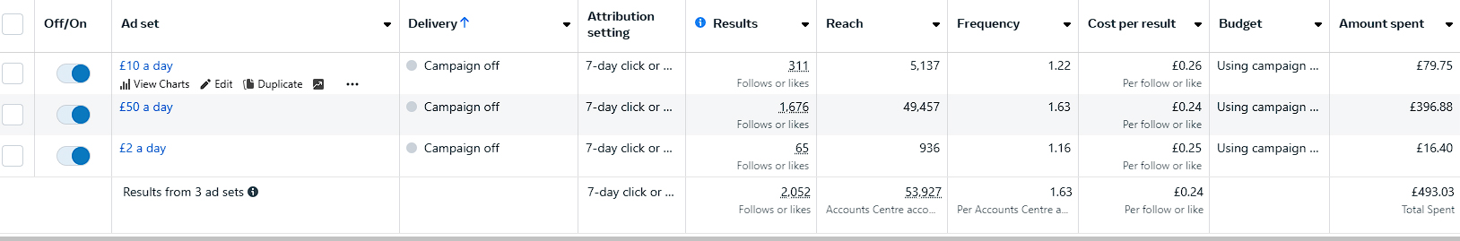 So, what do I recommend? Start your ads with a higher budget and then after a few days drop them down to a cheaper amount, this will result in the lowest overall cost per like for your campaign!