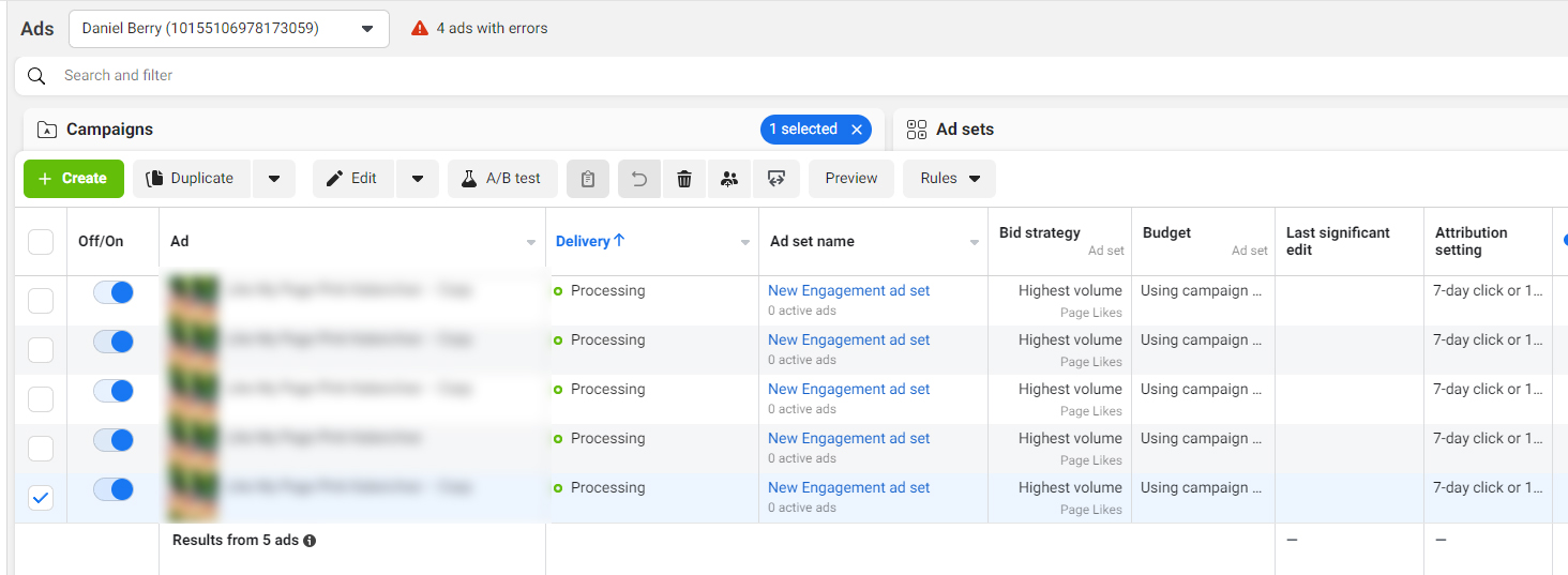 I started by setting up a brand new like campaign with 5 different ads under it. This should get new likes coming in at a good pace, which will help get the engagement spiking again.