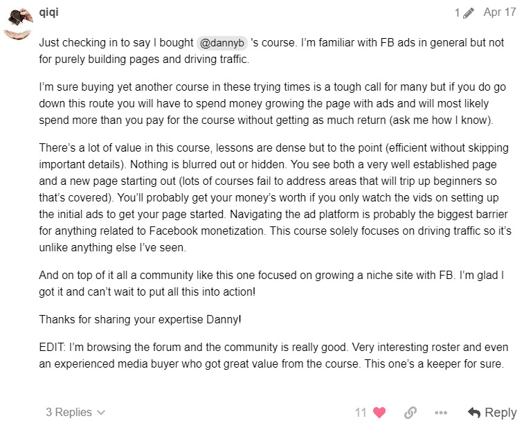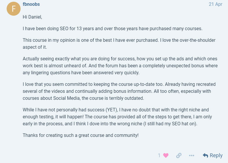 "The Facebook For Niche Sites course is a breath of fresh air for anyone looking to drive serious traffic to their website using Facebook. With his no-BS approach, Daniel delivers actionable insights and practical tips suitable for both beginners and existing page owners. He even shows his real life pages so you know he's the real deal. This course is a must-watch for anyone serious about leveraging Facebook for their business. It's everything you need really. Highly recommended."