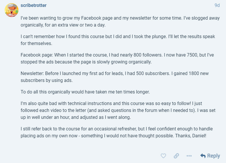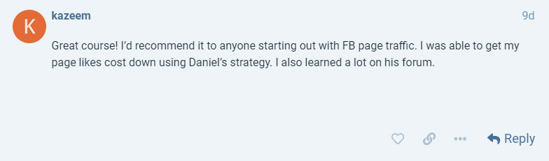 "This is an exhaustive Facebook traffic course covering everything you could need to know. But, what I love is how open Danny is. He shares his stats, his pages, his actual posts - not something you often see from other courses out there. Highly recommended!"