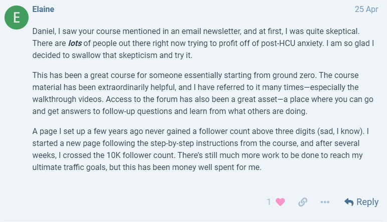 “Our organic traffic was demolished by the HCU so we’ve been looking for ways to replace that traffic, and income, in a meaningful way. The day after we completed this course our Facebook traffic tripled. Four days later we had gained over 4,000 new followers through, mostly organic, invites. Now when people mention Google I just respond, Google who? Don’t need them.”