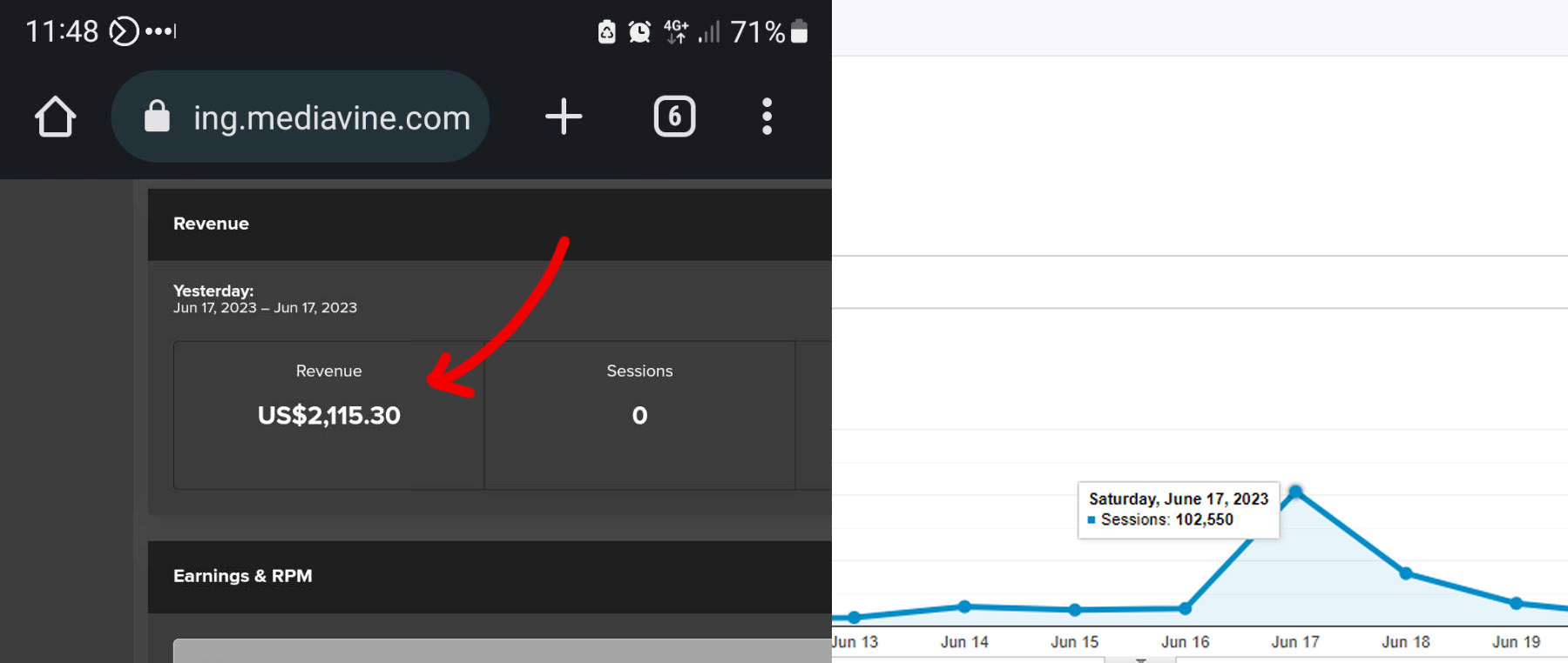 Here you can see my Mediavine dashboard, showing my earnings on my best day - as well as a Google analytics screenshot showing the traffic that day.