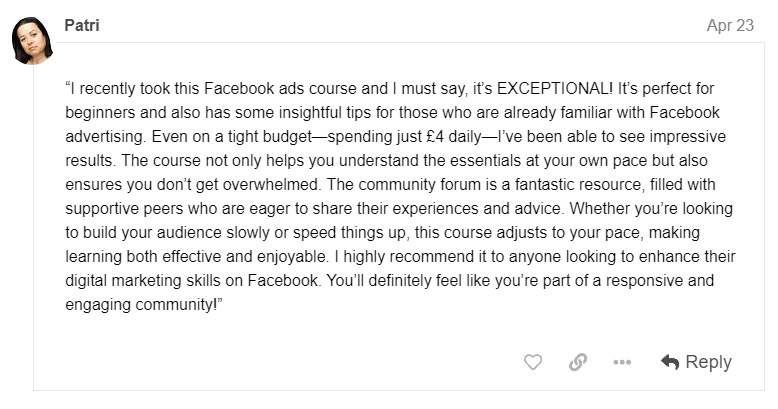 "This Facebook course is great! Whether you're a complete beginner or already have some Facebook ads set up, the course is packed with golden nuggets that will help you to grow your Facebook page, avoid any killer mistakes, and drive a ton of traffic to your website."